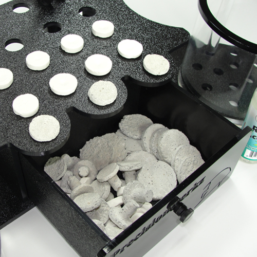 フラグステーションと聞いても中々日本ではピンと来ない方もいると思います。フラグとは「欠片」という意味です。要するに、サンゴの欠片をセラミックやプラスチック製のプラグやディスク(上記写真の真ん中にある白い物がそれにあたります)に接着する台が、フラグステーションと理解すればよいかと思います。今回、そんな便利なものを発売したのはPrecisionWerksです。アクアリストが非常に簡単にサンゴをプラグに接着できるように工夫されています。